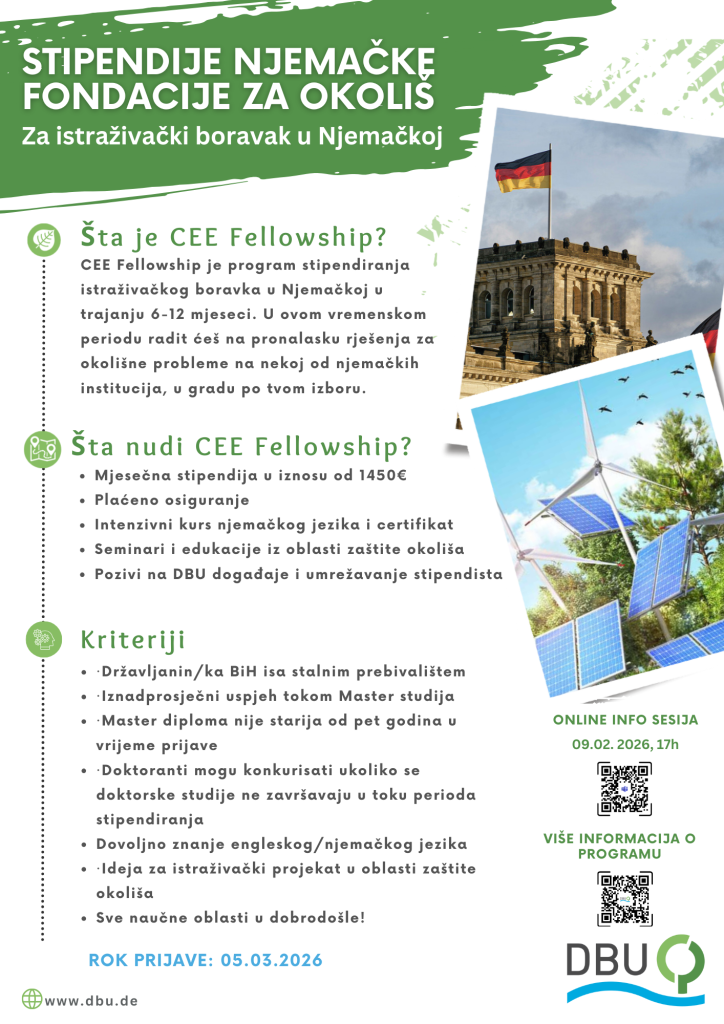 Zamisli da tvoje ideje ne ostanu samo u ladici ili na papiru, već postanu dio stvarnih rješenja za zaštitu okoliša – i to u srcu Evrope. Upravo takvu priliku nudi CEE Fellowship program Njemačke fondacije za okoliš (DBU): istraživački boravak u Njemačkoj koji povezuje znanje, inovacije i međunarodnu saradnju.